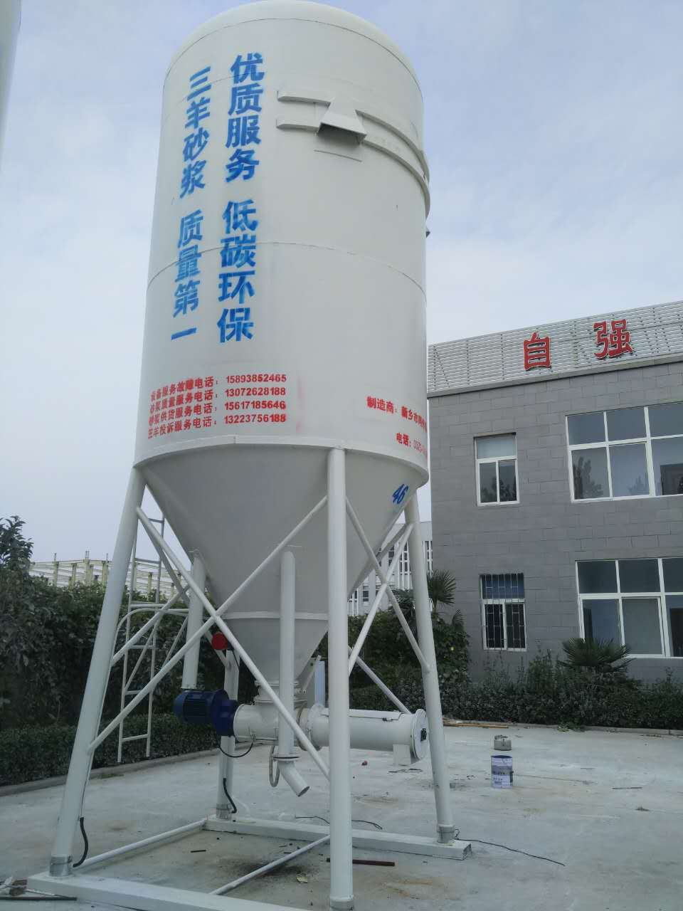 產量大的干粉砂漿設備,一般情況下會用到4-6個原料罐,其中兩個大罐用于裝放散裝水泥和粉煤灰,其余小罐用于裝放輕鈣、重鈣、砂、小料等。散裝水泥和粉煤灰進罐不需要提升設備,依靠泵車打入。散裝粉煤灰倉一般為圓筒支架結構,其上部有除塵設備,防止粉塵泄漏,下部裝有破拱裝置,防止粉料結塊,使粉料卸出順暢,并裝有料位傳感設備,可隨時掌握倉內物料使用情況。